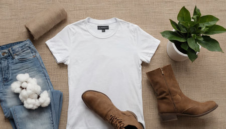 White t-shirt, jeans, boots and cotton flowers on a brown background