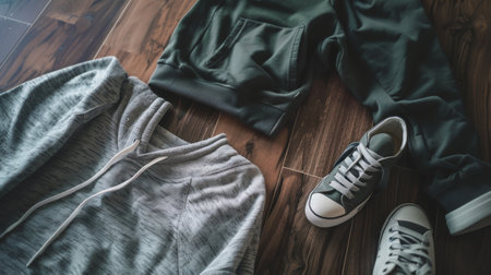 Casual Clothing Arrangement on Wooden Floor With Sneakers