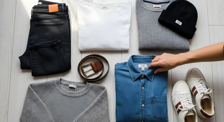A flat lay of a men's casual outfit including jeans, sweaters, a denim shirt, and white sneakers on a light wooden floor. A hand reaches in to adjust the collar of the blue shirt, finalizing the style arrangement.