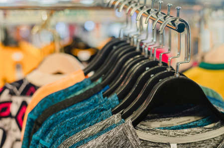 plain t-shirts of different colors hang on a hanger, store interior blur.