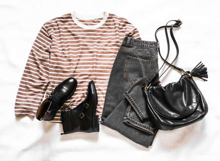 Gray jeans, black leather shoes, black leather bag, long sleeve striped t-shirt - women's clothing on a light background, top view. fashion concept