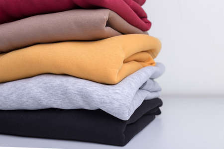 Stack of folded clothes at home on a wooden table decorated with a garland.