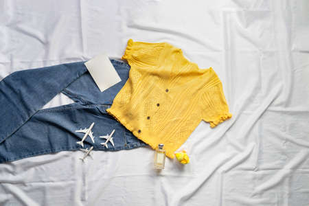 A yellow crop top paired with light colored vintage jeans. Comes with three little airplanes, a piece of paper postcard, and the chick doll on white bedsheet background.