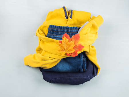 Autumn kids yellow and blue folded outfit with fall maple leaves. Flat lay on pastel blue background. Autumn fashion, wardrobe organization concept