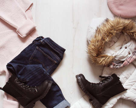 A set of fashionable winter women's clothing. Wool sweater, shoes, handbag, fur hat and gloves on white wooden background.