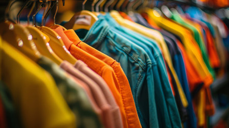 Colorful T-Shirts in a Row. Ideal for fashion, wardrobe, and retail themes, for casual wear, clothing stores, and style