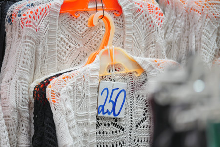 Row of clothes hanging on hanger with sale tags