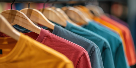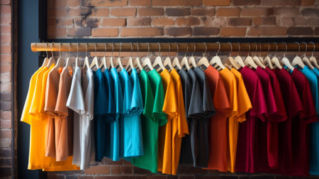 Colorful T-Shirts in a Row. Ideal for fashion, wardrobe, and retail themes, for casual wear, clothing stores, and style