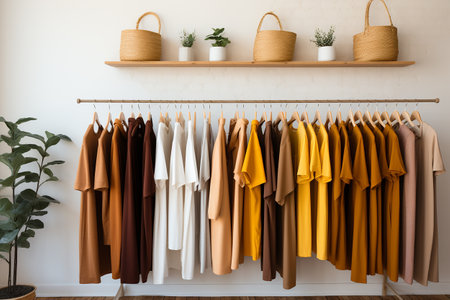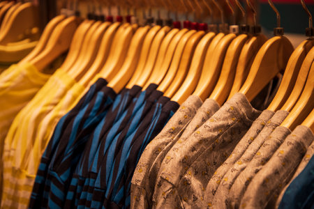 Colorful t-shirts hanging evenly on wooden hangers in a clothing store display. concept of fashion, apparel organization, shopping environment., banner.