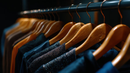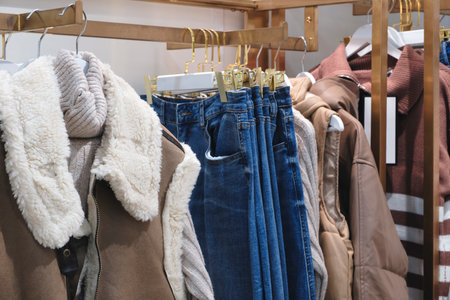 Boutique clothing rack featuring a variety of fashionable and stylish outerwear in warm tones. concept of fashion retail, style selection, clothing display.