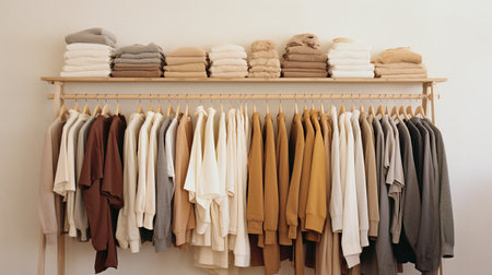 A vibrant display of clothing on hangers showcasing a variety of sweaters in soft tones. Perfect for fashion, retail, or home decor inspiration.