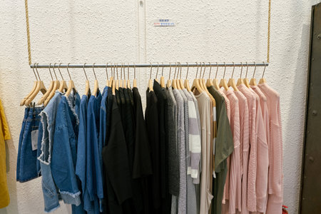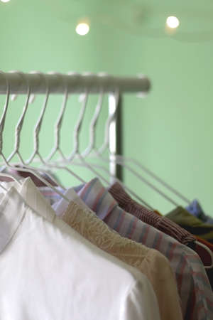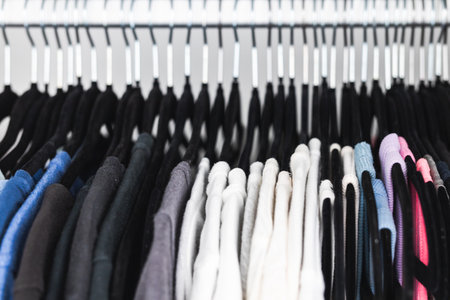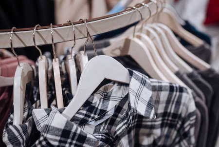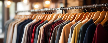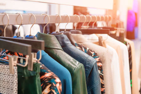 Shopping in store. Clothes on hangers in shop for sale. Blur background. Fashionable clothes in a boutique. Various clothing on market.