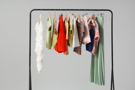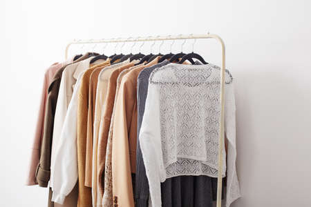 Gold floor wardrobe rack with pastel color fashion clothes near white wall. Shopping concept. High quality photo
