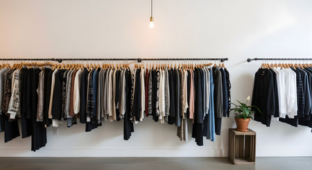 Sustainable fashion concept. Clothes hanging on a rack in second-hand clothing store. Creative, AI Generated