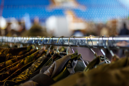 The concept of shopping. Selling and buying clothes. Clothes on hangers in a clothing store, thrift store, second-hand store, or street market.
