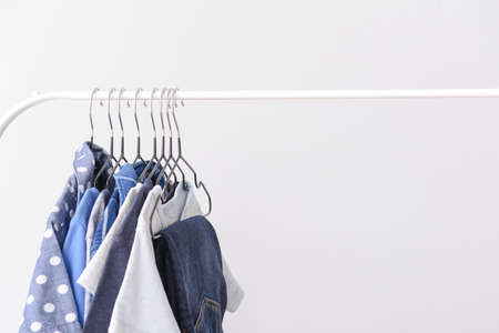 Rack with stylish children's clothes on hangers for a preschool boy. Wardrobe for a little boy.