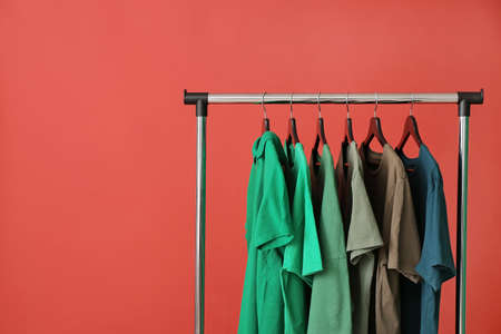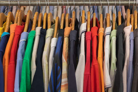 Colorful t-shirts and polo shirts. Preparation for the spring season. Shopping. Close-up. Clothing concept.