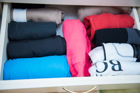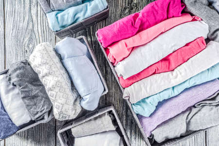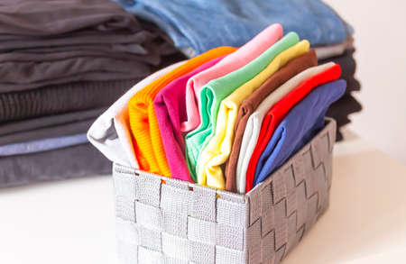 Folded colorful clothes in the box. Home organizing. Domestic vertical storage.