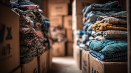 Piles of folded clothing and boxes fill a narrow storage room. The dim light highlights the textures and colors of the fabrics, creating a sense of organized chaos.