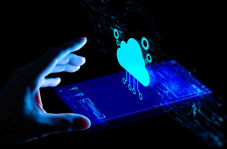 Abstract cloud technology digital. Communication network. Hand hold white smartphone with digital hologram cloud, download, data sign on light blurred back. Download Data Storage Business Technology.