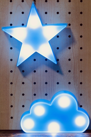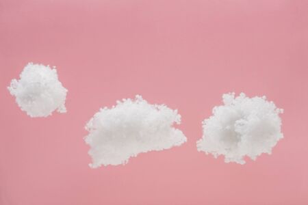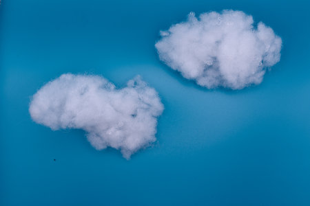 Two fluffy cotton pieces arranged as clouds against solid blue background, simulating sky in playful composition.