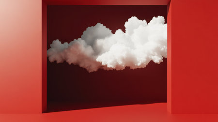 3d render. White fluffy cloud levitates in empty room with green floor, isolated on peachy background. Modern minimal gallery concept