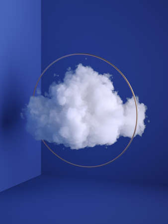 3d render, white fluffy cloud flying through the golden ring. Minimal room interior. Levitation concept. Objects isolated on blue background, modern design, abstract metaphor.