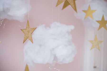 Hanging paper garland on beige background for childrens and adult holiday - birthday, new year, newborn. Pastel colors, light background. Copy space