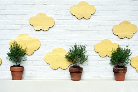 Flat lay design of travel concept with clouds on blue background with copy space.