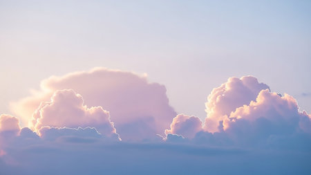 Cloudscape showing soft pastel pink and purple clouds illuminated by golden sunlight against a pale blue sky at dawn or dusk keywords: clouds, sky, pastel, pink,...