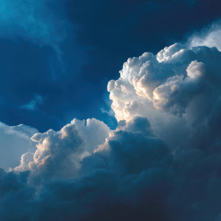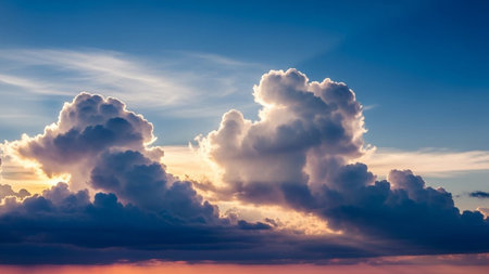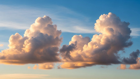 Large, fluffy cumulus clouds bathed in warm golden hour sunlight, set against a vibrant clear blue sky, creating a...