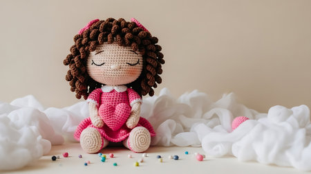 Handmade crochet doll with curly brown hair and pink dress surrounded by fluffy fabric and colorful beads.