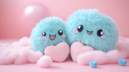 Two adorable cartoon characters are featured against a backdrop of soft clouds and warm lighting. The image showcases rounded forms and pastel colors, with a focus on a plush texture. The composition suggests a dreamlike environment, suitable for various creative projects and illustrating concepts of joy and friendship.