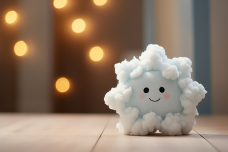 Adorable Light Blue Cloud Plushie Resting on a Wooden Surface Surrounded by Soft Bokeh Lights
