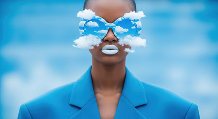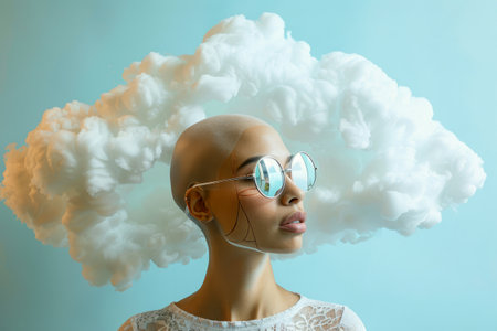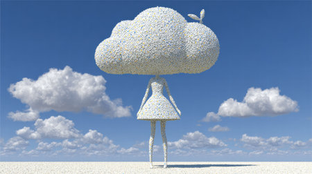 A surreal portrait of a person with a cloud head against a blue sky background.