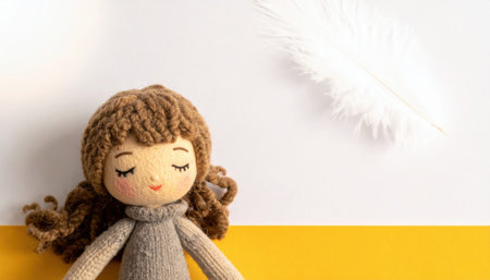 felted wool doll reclining on neutral paper airy high key feathered falloff calm studio scene for gentle craft mood and textile styling