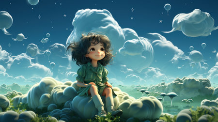Little girl sitting on a hill surrounded by clouds. 3d rendering