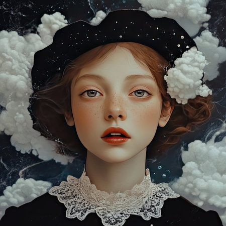 A captivating portrait of a young woman with freckles, framed by soft clouds. The dreamy atmosphere evokes a sense of calm and creativity, highlighting her serene beauty.