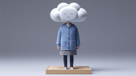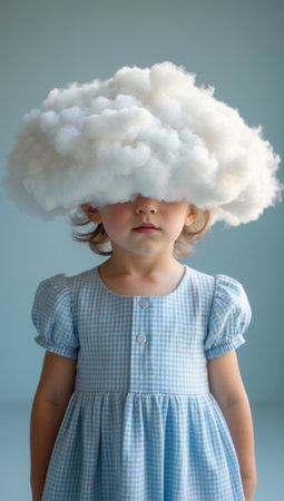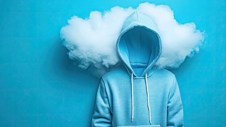A unique and surreal image featuring a hooded figure with a cloud for a head, set against a vibrant blue background. This represents a dreamy concept focused on creativity and imagination.