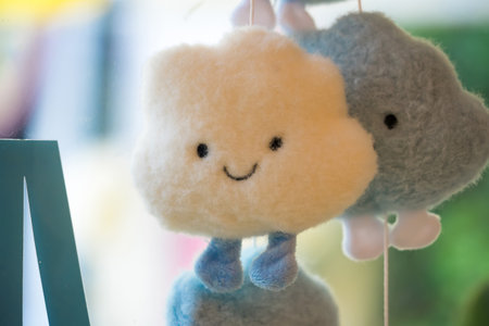 Cute plush cloud toy with a happy expression against a soft blue background, perfect for children s room decor and playtime activities