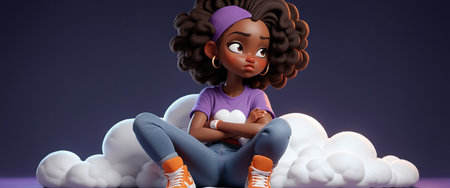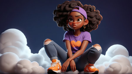 Pensive girl with curly hair and casual outfit sitting among clouds.
