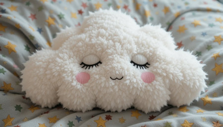 A cute plush cloud sits peacefully on a cozy blanket with vibrant star patterns, creating a warm atmosphere.