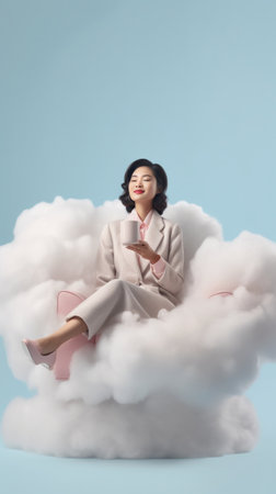 Young woman sits peacefully on a fluffy cloud in a vibrant blue sky.