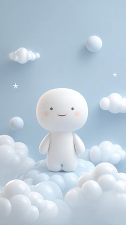 A charming illustration of a cloud-like character surrounded by soft, fluffy clouds against a serene blue sky background.
