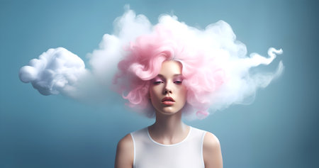 Surreal image of pensive female figure emerging from pastel clouds