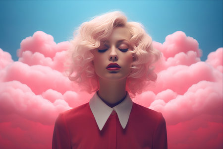 A young woman stands still her eyes covered by fluffy clouds against a pink background creating a dreamlike feel.