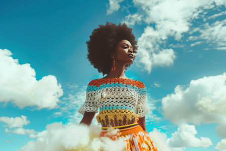 Young black woman wearing multicolored crocheted top and airy skirt, unusual collage photo with clouds, fashion magazine cover style, AI generated