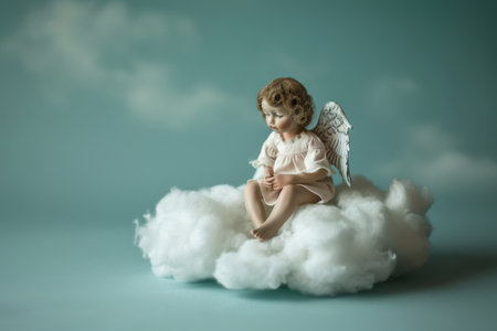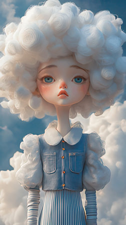An AI illustration of a charming angel doll seated gracefully on a fluffy cloud.