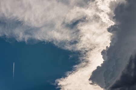 Large Cumulus cloud before the rain in the evening at sunset. The cloud is illuminated by the evening sunlight. Dangerous weather before rain or thunderstorm. Background, Wallpaper or backdrop