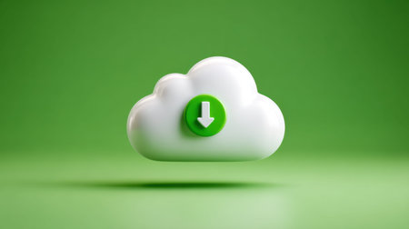 A sleek 3D cloud download icon featuring a green arrow on a bright green background. Ideal for digital storage and file transfer projects.